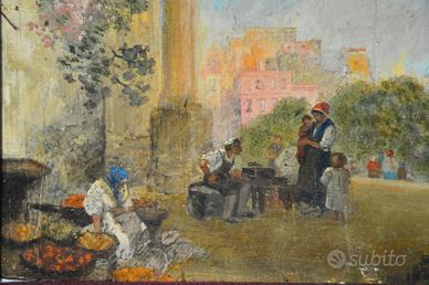 L’opera raffigura una vivace scena di vita popolare all’aperto, ambientata in un contesto architettonico che richiama atmosfere mediterranee o napoletane.