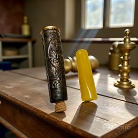 In mezzo a mille oggetti dimenticati, c’è sempre un dettaglio minuscolo che ti ferma il respiro. Quel dettaglio, questa volta, è la piccola parola Lourdes incisa su una lamina d’argento scura, consumata dal tempo quanto basta per raccontare un viaggio. Quando ho sollevato questo bocchino, la sensazione è stata quella di toccare un frammento di valigia d’inizio Novecento: un oggetto che probabilmente apparteneva a qualcuno che aveva attraversato la Francia con un treno lento, una valigia rigida e la fede nel cuore. Il metallo lavorato a sbalzo mostra la Grotta e l’apparizione, protette da un intreccio di gigli e foglie: una piccola scena sacra che qualcuno ha fatto scivolare tra le dita per più di cento anni. Svitando la parte gialla — liscia, calda, del colore dell’ambra — appare una filettatura in legno tornito, così antica da sembrare quasi un segreto meccanico. È in quel punto che si sente la vera epoca dell’oggetto: la cura minuta, la pazienza, la precisione artigianale di chi costruiva per far durare, non per far passare. Mentre lo guardi, è impossibile non immaginare chi l’ha usato: magari una donna elegante, forse un uomo che portava con sé un ricordo di un voto, o forse qualcuno che cercava semplicemente un piccolo talismano quotidiano. Eppure, oggi, è qui. Integro, bello, solido. Con la sua storia silenziosa che aspetta solo di ricominciare. Se chiudi gli occhi un istante, puoi quasi sentire lo scricchiolio del legno, il profumo di tabacco dolce, il rumore distante di una stazione.