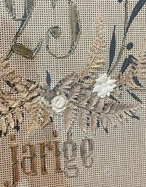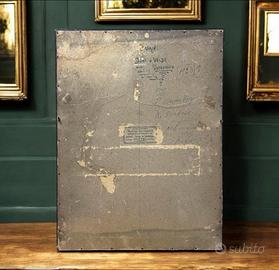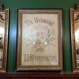 Questa dedica è incorniciata in una cornice originale dell’epoca, eseguita dalla Prima Corniceria Meccanica di Franeker (Eerste Franeker Machinale Lijstenmakerij), un laboratorio storico situato nel cuore della città, in Waagstraat 15 (scritta originale a tergo). Ma ciò che rende questo ricamo davvero unico è l’eccezionale utilizzo di fili d’oro e d’argento, combinati con simbologia vegetale: fiori e steli, fra cui felci, sono stati intrecciati a mano con maestria nella trama del tessuto. Questo dettaglio, raro e sorprendente, non è solo un elemento decorativo, ma un simbolo carico di significato. Le felci, in particolare, rappresentano amore duraturo, protezione e prosperità. La loro natura rigogliosa e resiliente riflette l’idea di un’unione coniugale solida e benedetta dal tempo. Questo ricamo è un omaggio ad un amore eterno: scegliete voi quale. Dimensioni grandi: 48 x 36 cm.