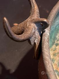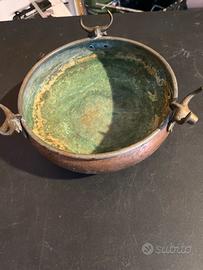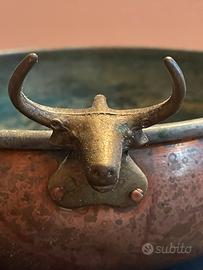 Antico recipiente da cucina in rame, realizzato artigianalmente, con interno originariamente stagnato e tre maniglie zoomorfe fuse.