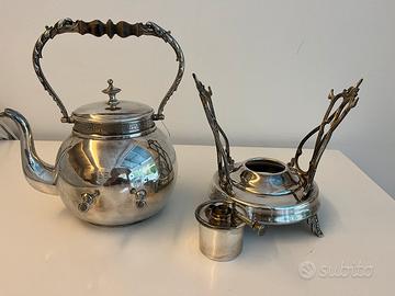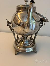 Vendo antica teiera samovar in metallo argentato con manico in legno. Probabile provenienza Inghilterra Altezza cm 29 Larghezza cm 24