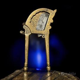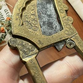 Tra i cortili assolati delle case nobili dell’India, quando la luce del mattino danzava sul pavimento in pietra e il tempo sembrava rallentare, c’era un gesto ripetuto con la solennità dei riti antichi: il taglio della noce di areca. Questo strumento, finemente cesellato in ottone, era un sarota - il custode di un rituale sociale e intimo. La noce di areca, dura e fibrosa, veniva spezzata con precisione millimetrica grazie alla lama affilata, per poi essere avvolta in una foglia intera di betel. Il risultato era il paan: una piccola composizione vegetale masticata per le sue proprietà stimolanti e digestive, ma anche offerta come simbolo di accoglienza, amicizia e legame. Si masticava durante le cerimonie, nei momenti di pausa, o come gesto di gentilezza verso l’ospite. E così il sarota passava di mano in mano, tramandato tra generazioni, decorato non solo da incisioni sottili, ma anche dai segni dell’uso, del tempo, della vita. Oggi, tenerlo in mano è come divenir custodi di una memoria collettiva.