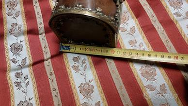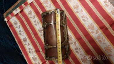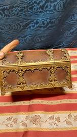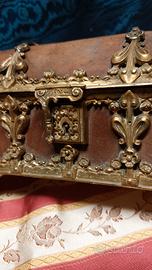 Antico Scrigno Cofanetto Portagioie Stile Neogotico 1800-1850 Bronzo Dorato pelle e velluto Chiave mancante, si tiene chiuso correttamente inserendo il perno all'interno della Serratura come in foto Misure in foto