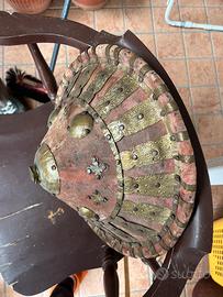 Etiopia, antico scudo da Ras in pelle ricoperta di velluto marrone e decorato di piastrine metalliche dorate, al verso è foderato in pelle rosso bruna, la forma e la fattura sono tipiche degli scudi di fine XIX