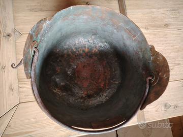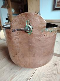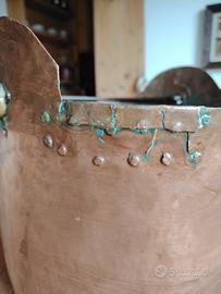 Antico Secchio In Rame Fine 1800 con manico in ferro anch'esso originale. Decisamente interessante per le numerose riparazioni che rendono l'oggetto unico.