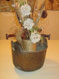 Antico grande secchio paiolo per trasporto acqua dell'800, area veneta, in rame cesellato con manico in ferro forgiato a mano.
