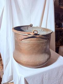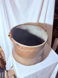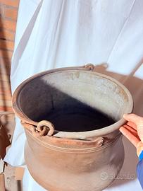 vendo secchio / paiolo in rame, di quelli di una volta, con la sua bella pancia larga e i manici in ferro forgiato che raccontano anni di uso e di fuoco. Il rame ha preso col tempo una patina naturale, irregolare e sincera, che lo rende affascinante così com’è, senza bisogno di lucidature forzate. È un oggetto solido, pesante, fatto per durare, perfetto come pezzo decorativo rustico, per una cucina di carattere o anche come grande contenitore scenografico. Dimensioni: diametro 37 cm x altezza 35 cm . Disponible la spedizione o ritiro di persona.