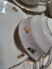 SERVIZIO DA CAFFÈ PRIMI 900. IN PORCELLANA BIANCA CON DECORAZIONI DI FIORELLINI SPARSI E BORDI IN ORO , COMPOSTO DA SEI TAZZINE CON PIATTINO E ZUCCHERIERA,UNA TAZZINA PRESENTA DIFETTO COME DA FOTO ,MARCATE