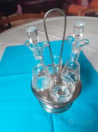 Porta olio e aceto sale e pepe con 2 bottigliette di ml 110 e 2 vasetti in vetro con doppio sostegno in acciaio primo Novecento ( forse 1930).
