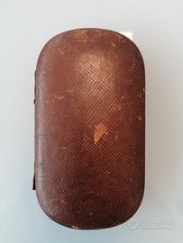 Scatola in pelle con alcuni segni. Come è possibile vedere nella foto, il cuoio che tiene insieme le due parti si è diviso, ma restaurabile.