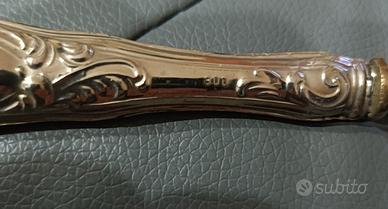 I manici sono in Argento 800, il resto in Ottone. Il peso totale è di 433 grammi, presumibilmente l'Argento è circa la metà del peso.