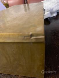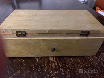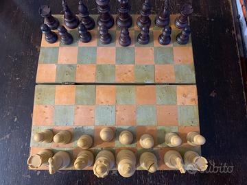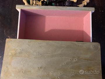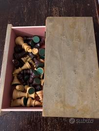 Cofanetto in legno rivestito di color verde. Scacchi contenuti in un cassetto rivestitodi velluto rosa