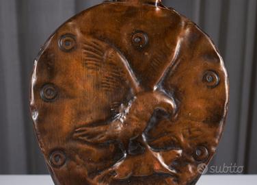 ▸ Elegante soffietto da camino con corpo in legno e rivestimento in rame sbalzato, impreziosito da una decorazione centrale a rilievo raffigurante scena naturalistica (uccello e preda), lavorata artigianalmente.