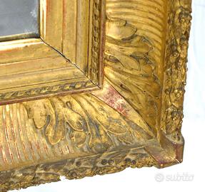Specchiera Napoletana d’epoca Luigi XVI, realizzata nella seconda metà dell’Ottocento, caratterizzata da una cornice in legno di pioppo ingessato e dorato con ricca decorazione a motivi floreali e fogliati tipici dell’epoca.