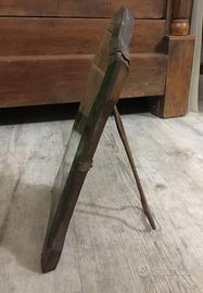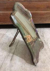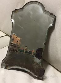 L'oggetto mostrato nell'immagine è probabilmente uno specchio veneziano antico, caratterizzato da una forma sagomata e da una decorazione dipinta a mano raffigurante una scena architettonica tipica di Venezia.