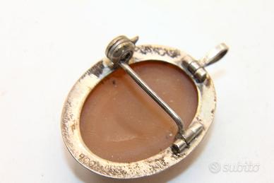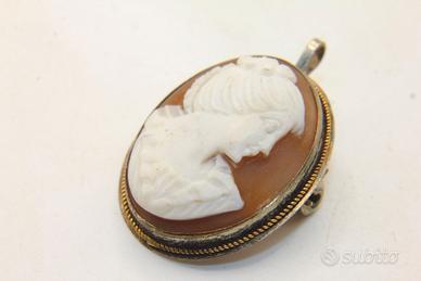 Questo splendido cammeo antico rappresenta un autentico capolavoro di artigianato d'epoca, caratterizzato da un'incisione finissima su conchiglia naturale che ritrae un nobile profilo femminile di ispirazione classica. La raffinata montatura è realizzata in argento massiccio con titolo 900, come chiaramente indicato dal punzone impresso sul retro della cornice. L'ovale misura 24 x 18 mm ed è impreziosito da un elegante bordo a cordina lavorata che dona profondità e prestigio al gioiello. Grazie alla presenza sia di un ago posteriore che di un passante superiore, l'oggetto offre una straordinaria versatilità d'uso, potendo essere indossato con eleganza sia come spilla che come ciondolo.