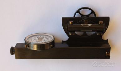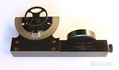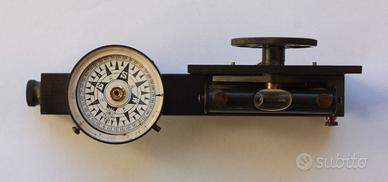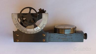 Antico e raro strumento composto da due strumenti base: una livella di Abney ed una bussola, prodotto e brevettato da Francis Barker & Son, London, nel 1900 circa, realizzato su richiesta di Bardelli & C., Torino. Lo strumento è in ottone con bella laccatura di protezione, utilizzato nel rilevamento di angoli sia nel piano verticale che nel piano orizzontale. La livella di Abney comprende una piccola livella mobile ed un clinometro a lettura indiretta tramite un goniometro argentato dotato di nonio per lettura di precisione, il tutto fissato su un tubo di mira fisso, ad un’estremità del quale è alloggiata una bussola per il rilevamento di angoli azimutali. Il clinometro presenta un arco con doppia graduazione: una scala in gradi sessagesimali suddivisa in due settori ± 60 gradi ed una scala di lunghezze fino a 10 metri. Quadrante bussola: rosa dei venti con 32 suddivisioni e fiore di giglio (Nord magnetico). Dimensioni: lunghezza 12 cm, altezza 6 cm circa, diametro bussola 36 mm. Peso complessivo pari a 160 grammi circa.
