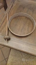 Antico strumento per il ricamo, precisamente un telaio da ricamo in legno, spesso utilizzato in passato per tendere il tessuto durante la lavorazione. Oggetto: Telaio da ricamo con bastoncino in legno, probabilmente parte di un set per lavori manuali d'epoca. Utilizzo: Serve a mantenere il tessuto teso per facilitare il ricamo a mano o il punto croce. Materiale: Legno naturale. Stato: Oggetto vintage, potenzialmente un pezzo da collezione per appassionati di utensili domestici antichi.