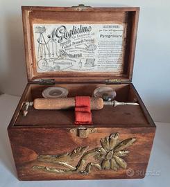 Antico Strumento Pirografo A. GUGLIELMO Torino primi del 900 Kit , con ancora sostanza originale solidificata, custodia particolare in legno con inserti in ottone . no tutto subito.Vendo € 138 . Gradito contatto telefonico wapp 3478314154