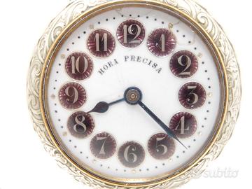 Antico orologio da tasca Roskopf primi del 900 con quadrante in ceramica a CARTOUCHE e vetro minerale . Movimento meccanico a carica manuale . Cassa interamente lavorata con scena di lotta e motivi floreali in rilievo sul retro . Diametro cassa mm 53 . L'orologio e' in buone condizioni e funzionante.