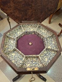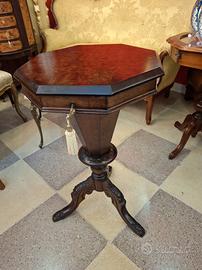 Presenta un basamento caratterizzato da un fusto centrale a imbuto rovesciato e da gambe mosse e intagliate. Piano ottagonale impiallacciato in radica, che si solleva per rivelare un vano interno, originariamente per riporre materiali da cucito, ma utilizzabile anche come portagioie.