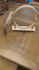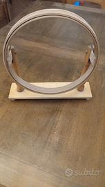 Antico telaio da ricamo con base (o supporto), uno strumento fondamentale per chi pratica il ricamo a mano, il punto croce o il quilting. Cos'è e a cosa serve Si tratta di un cerchio in legno montato su un piedistallo che permette di mantenere il tessuto ben teso durante la lavorazione. La tensione uniforme è cruciale per evitare che i punti deformino la stoffa e per ottenere un risultato preciso e pulito. Vantaggi dell'uso con base Rispetto ai telai manuali semplici, il modello con base offre diversi benefici: Mani libere: Il supporto permette di ricamare utilizzando entrambe le mani (una sopra e una sotto il tessuto), velocizzando il lavoro e migliorando la precisione. Postura corretta: Essendo un telaio da tavolo o da appoggio, aiuta a mantenere una posizione più ergonomica, riducendo l'affaticamento di collo e schiena. Regolabilità: Molti di questi telai consentono la rotazione del cerchio (spesso a 360°) per regolare l'angolazione in base alla comodità di chi ricama.