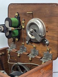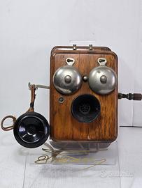 Antico telefono da parete con cassa in legno risalente ai primi del XX secolo tra il 1900 e gli anni 20 è caratterizzato da una scatola in leano in rovere che ospita i componenti interni, composto da due campanelle metalliche per la suoneria un microfono fisso a imbuto e un ricevitore separato appeso a un gancio laterale funzionamento a manovella (generatore a maanete) non è una replica moderna è un pezzo della nostra storia è in ottime condizioni unico