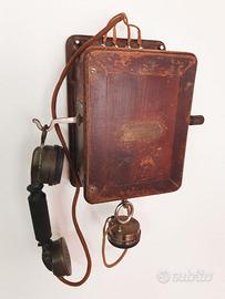 Antico telefono francese da parete con cassa in legno primi anni del 900. Cornetta principale a sinistra e manovella a destra usata per generare l'energia necessaria per chiamare il centralino. All'interno il meccanismo integro e completo. Inoltre un secondo auricolare per far ascoltare la conversazione ad una seconda persona.