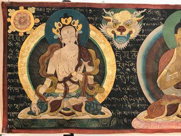 Thangka orizzontale tibetano realizzato per monasteri, dipinto a mano su tela di cotone, con scritte in oro su sfondo nero e figure colorate. L'oro utilizzato è 24 carati. I pigmenti idrosolubili sono sia minerali che organici e sono temperati con una soluzione di erba e colla organica naturale.