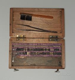 Antico timbro personalizzabile con relativa scatolina in legno contenente: