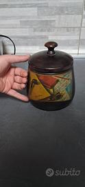 Elegante barattolo umidificatore humidor realizzato in legno tornito con finitura scura. Il corpo centrale e decorato con una decalcomania vintage che raffigura una pipa, un libro e una mappa geografica in stile classico. Il coperchio e dotato internamente del sistema di umidificazione originale in metallo con chiusura a viti. L oggetto presenta i naturali segni del tempo che ne confermano l autenticita, incluse alcune fessurazioni del legno sul bordo interno del coperchio e una leggera patina di ossidazione sulle parti metalliche interne. Perfetto come pezzo da collezione per amanti del tabacco o come complemento d arredo per studi e librerie.