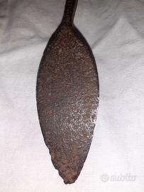 Antico utensile in ferro battuto, lunghezza 24 cm, con doppia estremità a forma di cucchiaio/paletta (cm 7 cadauna estremità) Oggetto probabilmente artigianale, utilizzato in passato come: dosatore per polveri o spezie utensile da cucina antica strumento da laboratorio/farmacia Non presenta marchi o incisioni visibili. Condizioni come da foto Ideale per: collezionisti di oggetti antichi arredamento rustico o industrial appassionati di antiquariato prezzo 20 euro