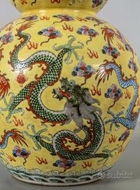 antico grande vaso cinese a doppia zucca marchio invetriato sotto porcellana soggetto Dragoni altezza 60 cm perfetto no rotture scheggiature restauri