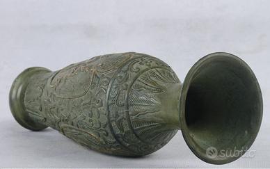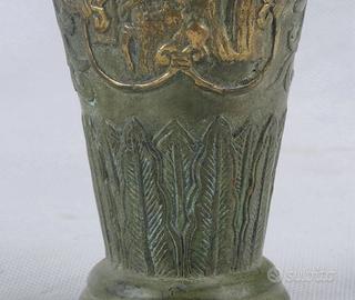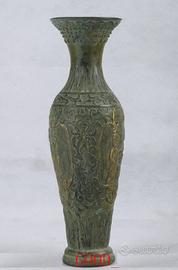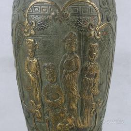 Antico vaso cinese in bronzo dorato - marchio Qianlong - periodo Repubblica Descrizione dell'oggetto Vaso cinese a balaustro in bronzo con finiture dorate, risalente alla prima metà del XX secolo (Periodo della Repubblica Cinese). Il vaso presenta una ricca decorazione a rilievo con figure della tradizione popolare e motivi floreali. Sulla base è presente il sigillo imperiale apocrifo a quattro caratteri "Qianlong Nian Zhi", un classico omaggio alla qualità artistica della dinastia Qing. Condizioni: Sano, integro e perfetto. Presenta una bellissima patina del tempo con naturali tracce di ossidazione verde (verderame) che ne attestano l'epoca. Materiale: Bronzo pesante con tracce di doratura. Dimensioni: Altezza 23,8 cm | Larghezza 7,8 cm | Profondità 7,8 cm.Peso: 550 grammi. Pezzo da collezione ideale per amanti dell'arte orientale e dell'antiquariato. Spedizione accurata con imballaggio protettivo specifico.