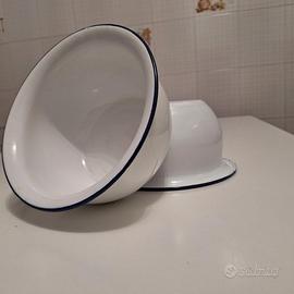 Antico vaso da notte o pitale in metallo smaltato bianco con bordi blu sotto il timbro del marchio Due Leoni Misure diametro cm.22 altezza cm.11,5
