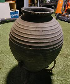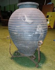 Antico vaso di terracotta usato per alimenti su un suppporto in ferro forgiato a mano da collezione. Altezza 66 cm e diametro 40 cm