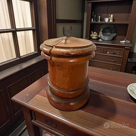 Vaso per conservazione di erbe medicinali, piante officinali essiccate, tabacco sfuso o materiali secchi. Epoca: fine XIX – inizi XX secolo. Materiale: legno tornito con elemento in ferro. Altezza: 19 cm. Diametro: circa 9 cm. Condizioni: buone condizioni generali; crepa sul coperchio, fissata e stabile, coerente con l’età. Interno: pulito, integro, senza segni di calore.