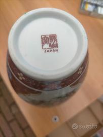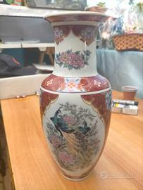 Antico vaso portafiori made in Japan ( vedi foto), in ceramica raffigurante dei pavoni,simboli di fortuna , fondo bianco , disegni in rosso magenta e azzurro. Molto bello. Per collezionisti di ceramiche artistiche
