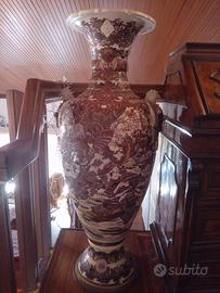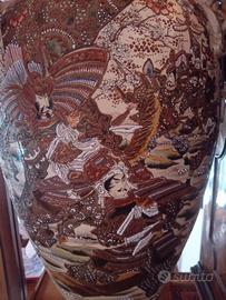 Vaso Satsuma giapponese antico del 1890 di grandi dimensioni 120cm di altezza, epoca Meiji, decorato in basso rilievo realizzato a mano , con dettagli minuziosi e in oro con bassi rilievi di shogun in uniforme e geisha in kimono.