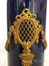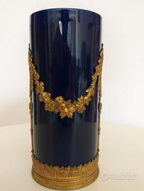 Prezioso vaso in porcellana blu di Sèvres con finitura in bronzo dorato, conservato molto bene, in stile Luigi XVI, della manifattura Paul Milet di Sèvres. Il blu lapislazzuli della porcellana, e la doratura del bronzo, lo rendono un oggetto di grande eleganza e da collezionismo. L’oggetto è ottimamente conservato, come da foto e non presenta sbeccature. Il marchio è presente sulla parte inferiore. Misure: H.18,5 cm x diametro 8 cm