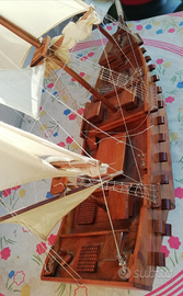 Antico veliero in legno, vele di stoffa bianca, in discreto stato, da restauro.