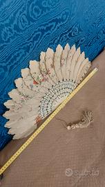 Antico Ventaglio Francese Belle Epoque Seta Osso E Intarsi In Argento 1860-1890. Misure in foto Seta dipinto a mano tipologia pavoneggiante Le stecche in Osso Traforato a mano presentano degli intarsi in lamina di argento