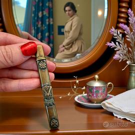 Entraygues. Un cognome inciso, non per essere visto, ma per essere riconosciuto subito. Questo gancio allaccia bottoni antico era un compagno silenzioso: aiutava a chiudere guanti sottili o bottoni ostinati di scarponcini eleganti, quando vestirsi era un gesto che richiedeva pazienza e cura. La custodia in ottone, decorata e consumata nei punti giusti, racconta un uso quotidiano, discreto, personale. È un oggetto nato per farsi notare, con simboli importanti nobiliari ed araldici sulla custodia. È nato per servire, e per appartenere a qualcuno che voleva intensamente dichiarare la sua intensità di persona ed il suo status sociale. Oggi resta come una piccola presenza carica di intimità, capace di evocare cassetti, mani attente, attese prima di uscire. Uno di quegli oggetti che riescono ancora a mettere soggezione.