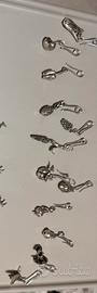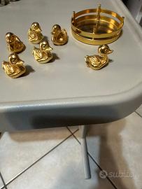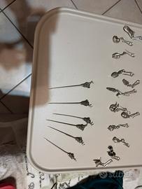 piccole statuine in metallo (probabilmente peltro o lega argentata) raffiguranti personaggi in stile antico (tipo servitori, musicisti o figure settecentesche).segnaposto da tavola oppure portatovaglioli / ferma-tovagliolo decorativi 👉 in alternativa clip per menu o bigliettini (molto usati nelle tavole eleganti anni ’60–’80), Spilloni lunghi con grappolo d’uva •Sono forchettine/spilloni da aperitivo o cocktail •Servivano per infilzare olive, formaggi, stuzzichini •Molto tipici anni ’60–’80 2.Le miniature con gancetto •Sono segnaposto o clip da tavola •Alcuni a tema frutta (ananas, uva, ecc.) •Si usavano per tenere bigliettini, tovaglioli o decorare la tavola -un set decorativo vintage con paperelle in ottone Set statuine 60 euro Set Spilloni lunghi con grappolo d’uva 30 euro Set Clip/segnaposto 40 euro set decorativo vintage con paperelle in ottone 50 euro