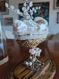 Antica rappresentazione del simulacro di Maria Bambina dal volto realizzato in cera, contenuto in teca di vetro soffiato. Donato alla nonna in occasione della nascita di mia madre nel 1925. Tali piccole riproduzioni del grande simulacro del 1700 sito nel santuario delle Suore di Carità a Milano, fino agli anni '30 venivano realizzate a mano, di solito dalle monache, e poi donate come simbolo benaugurante alle giovani spose e/o alle puerpere. Successivamente e ancora oggi si trovano realizzati in plastica o resina.