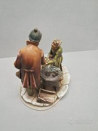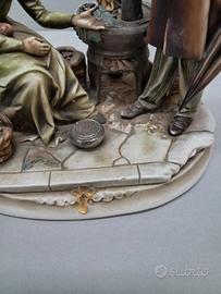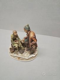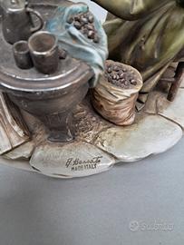 Figura in porcellana firmata Antonio Borsato, una coppia di anziani si tiene per mano vicino ai fornelli. La figura è firmata e timbrata sul fondo.