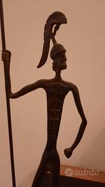 Raffigurazione di un guerriero con lancia e elmo stilizzato, caratterizzata da linee affusolate ed eleganti, con patina originale.
