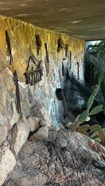 Oggetti in ferro e ferro battuto assortiti: pinze, tenaglie, chiavi antiche, due riquadri decorativi, un piccolo accessorio con croce dei cavalieri di malta, uno scalpellino (non è tra le foto), una sega a mano (non è tra le foto).
