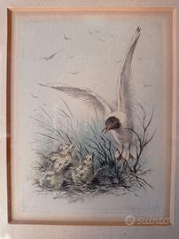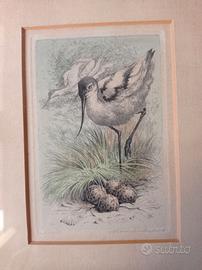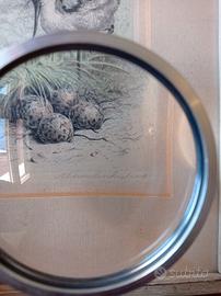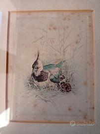 Stampe con soggetto ornitologico acquistate nel 1960 ad Amsterdam, Olanda (vedi retro cornice). Si vende l'intero set di 3 stampe. Acquerellate. Ogni stampa è numerata e firmata. In ottimo stato, solo una riporta sulla carta alcuni leggeri segni del tempo (vedi immagine 4). Cornice originale di un delicato colore verde acqua. Misure cm 22,5 x cm 18. La lente di ingrandimento NON è in vendita.