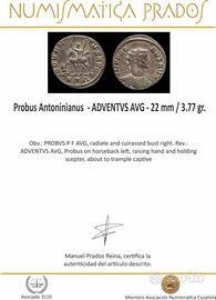 Splendida moneta risalente all'Impero Romano. Antoniniano in argento dell’imperatore Marco Aurelio Probo, emesso tra il 276 e il 282 d.C., con la legenda ADVENTVS AVG, che celebra l’ingresso solenne dell’imperatore.